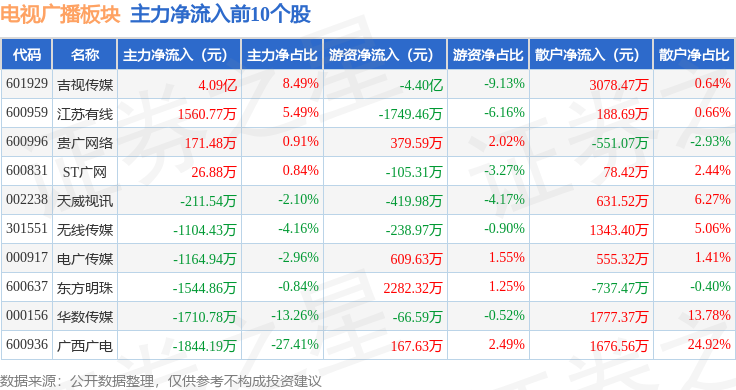从资金流向上来看,当日电视广播板块主力资金净流入2.04亿元,游资资金净流出3.89亿元,散户资金净流入1.85亿元。电视广播板块个股资金流向见下表: