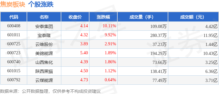 证券之星消息,11月5日焦炭板块较上一交易日上涨3.17%,安泰集团领涨。当日上证指数报收于3969.25,上涨0.23%。深证成指报收于13223.56,上涨0.37%。焦炭板块个股涨跌见下表: