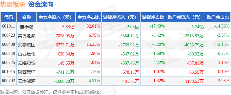 从资金流向上来看,当日焦炭板块主力资金净流入5.06亿元,游资资金净流出2.71亿元,散户资金净流出2.34亿元。焦炭板块个股资金流向见下表: