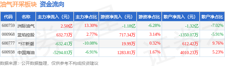从资金流向上来看,当日油气开采板块主力资金净流入1.98亿元,游资资金净流出9809.64万元,散户资金净流出9945.51万元。油气开采板块个股资金流向见下表: