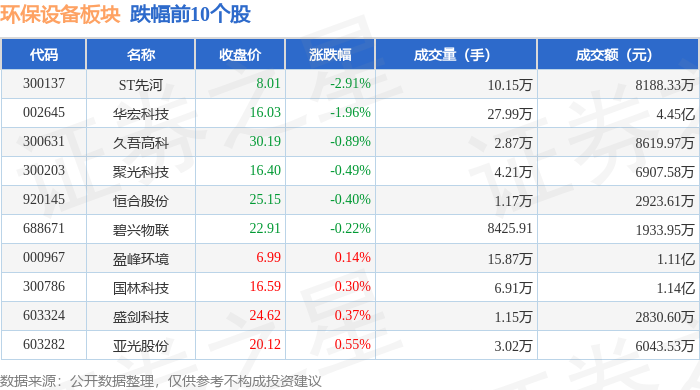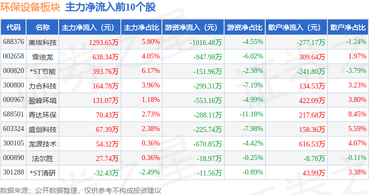 从资金流向上来看,当日环保设备板块主力资金净流出9399.46万元,游资资金净流出4642.19万元,散户资金净流入1.4亿元。环保设备板块个股资金流向见下表: