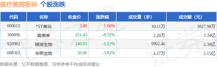 证券之星消息,11月5日医疗美容板块较上一交易日下跌1.7%,华熙生物领跌。当日上证指数报收于3969.25,上涨0.23%。深证成指报收于13223.56,上涨0.37%。医疗美容板块个股涨跌见下表: