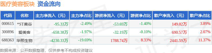 从资金流向上来看,当日医疗美容板块主力资金净流出4984.04万元,游资资金净流入1702.86万元,散户资金净流入3281.18万元。医疗美容板块个股资金流向见下表:
