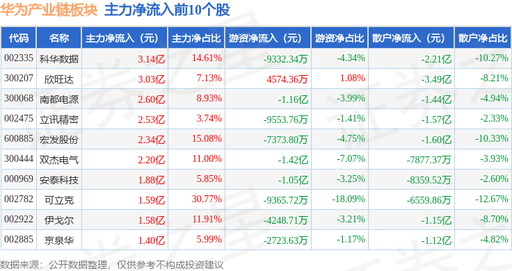 从资金流向上来看,当日华为产业链板块主力资金净流出87.56亿元,游资资金净流入12.79亿元,散户资金净流入74.77亿元。华为产业链板块个股资金流向见下表: