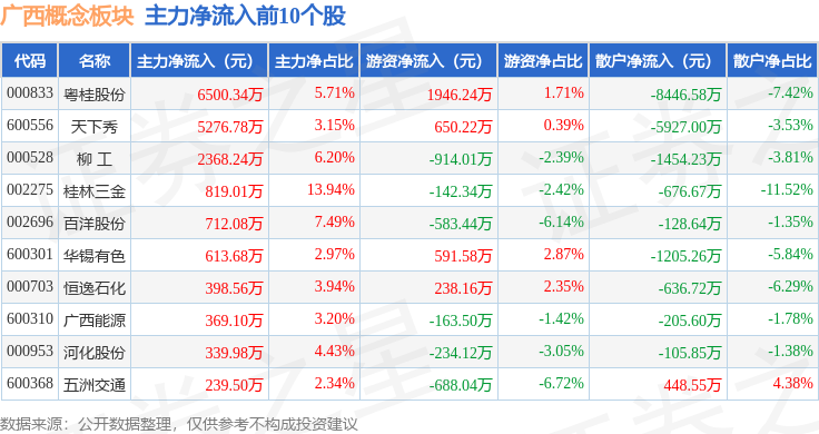 从资金流向上来看,当日广西概念板块主力资金净流出4598.31万元,游资资金净流出506.32万元,散户资金净流入5104.63万元。广西概念板块个股资金流向见下表: