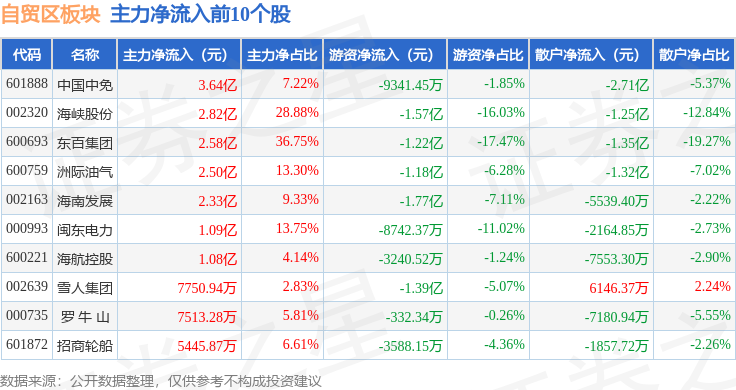从资金流向上来看,当日自贸区板块主力资金净流出4.55亿元,游资资金净流出7.5亿元,散户资金净流入12.04亿元。自贸区板块个股资金流向见下表: