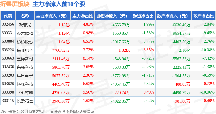 从资金流向上来看,当日折叠屏板块主力资金净流出7.44亿元,游资资金净流入1.66亿元,散户资金净流入5.79亿元。折叠屏板块个股资金流向见下表: