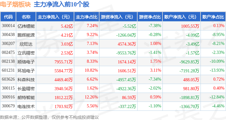 从资金流向上来看,当日电子烟板块主力资金净流入12.42亿元,游资资金净流出4.94亿元,散户资金净流出7.49亿元。电子烟板块个股资金流向见下表: