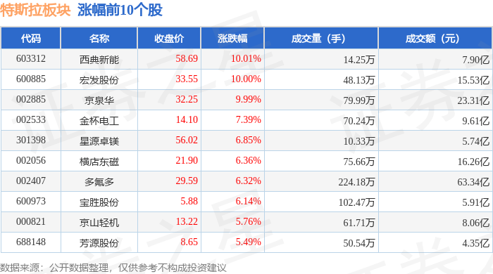 证券之星消息,11月5日特斯拉板块较上一交易日上涨1.24%,西典新能领涨。当日上证指数报收于3969.25,上涨0.23%。深证成指报收于13223.56,上涨0.37%。特斯拉板块个股涨跌见下表: