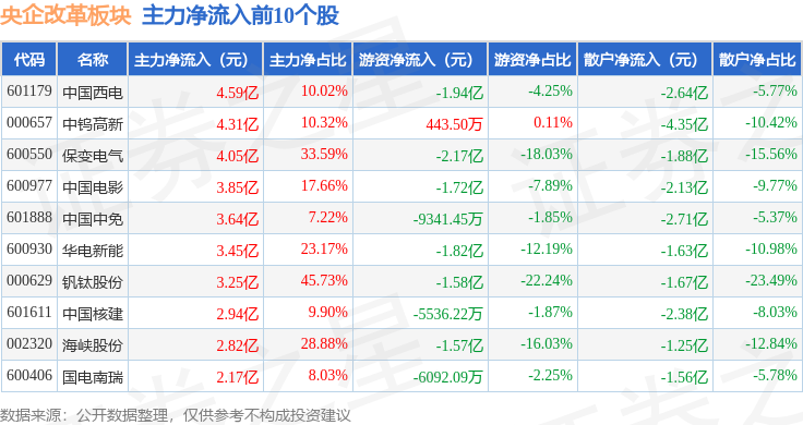 从资金流向上来看,当日央企改革板块主力资金净流入4.58亿元,游资资金净流出16.22亿元,散户资金净流入11.64亿元。央企改革板块个股资金流向见下表: