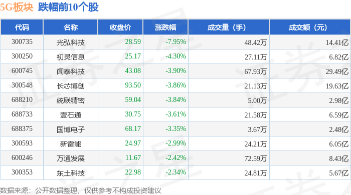 证券之星消息,11月5日5G板块较上一交易日下跌0.04%,光弘科技领跌。当日上证指数报收于3969.25,上涨0.23%。深证成指报收于13223.56,上涨0.37%。5G板块个股涨跌见下表: