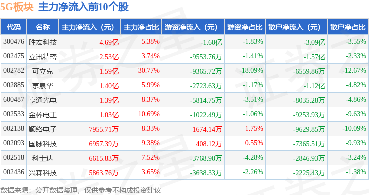 从资金流向上来看,当日5G板块主力资金净流出36.67亿元,游资资金净流入5.38亿元,散户资金净流入31.29亿元。5G板块个股资金流向见下表: