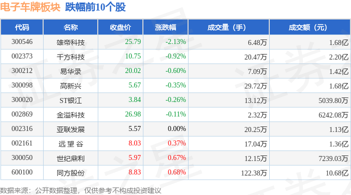 从资金流向上来看,当日电子车牌板块主力资金净流出1.44亿元,游资资金净流出2504.61万元,散户资金净流入1.69亿元。电子车牌板块个股资金流向见下表: