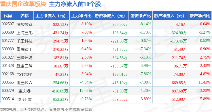从资金流向上来看,当日重庆国企改革板块主力资金净流出4376.48万元,游资资金净流出1757.41万元,散户资金净流入6133.89万元。重庆国企改革板块个股资金流向见下表: