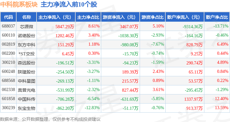 从资金流向上来看,当日中科院系板块主力资金净流出4.51亿元,游资资金净流入1.8亿元,散户资金净流入2.71亿元。中科院系板块个股资金流向见下表: