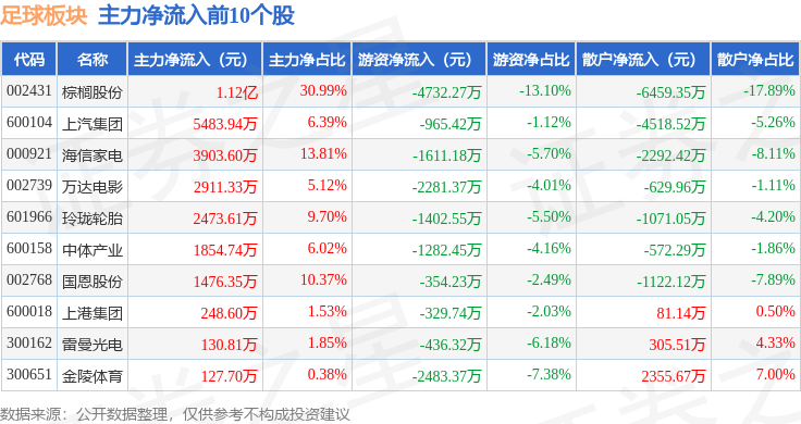 从资金流向上来看,当日足球板块主力资金净流出4.96亿元,游资资金净流出3505.48万元,散户资金净流入5.31亿元。足球板块个股资金流向见下表: