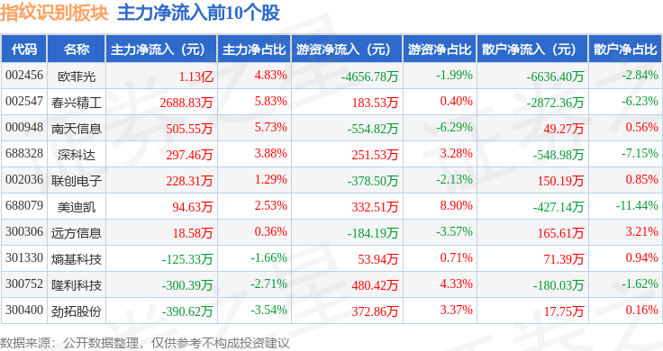 从资金流向上来看,当日指纹识别板块主力资金净流出5.28亿元,游资资金净流出4952.42万元,散户资金净流入5.78亿元。指纹识别板块个股资金流向见下表: