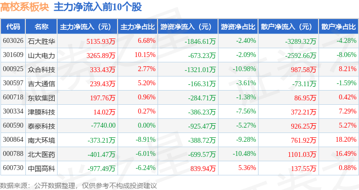 从资金流向上来看,当日高校系板块主力资金净流出6.47亿元,游资资金净流入371.29万元,散户资金净流入6.43亿元。高校系板块个股资金流向见下表: