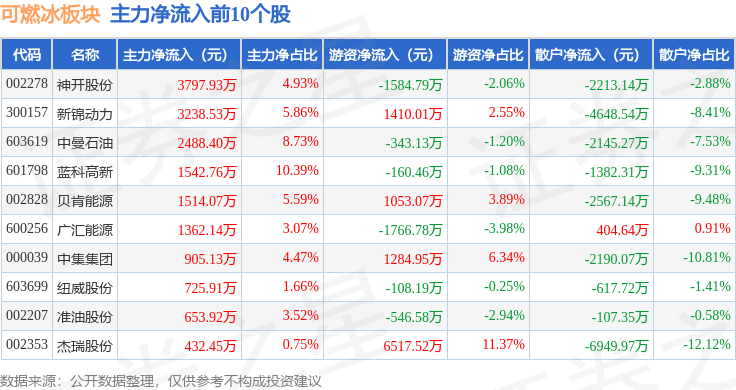 从资金流向上来看,当日可燃冰板块主力资金净流出1.75亿元,游资资金净流入9200.46万元,散户资金净流入8312.34万元。可燃冰板块个股资金流向见下表: