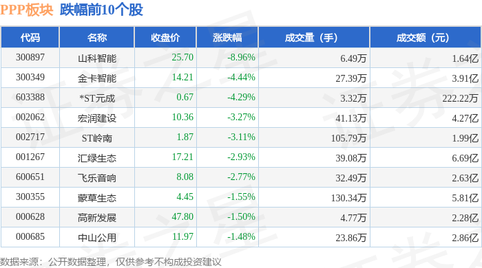 从资金流向上来看,当日PPP板块主力资金净流出15.13亿元,游资资金净流入7925.76万元,散户资金净流入14.34亿元。PPP板块个股资金流向见下表: