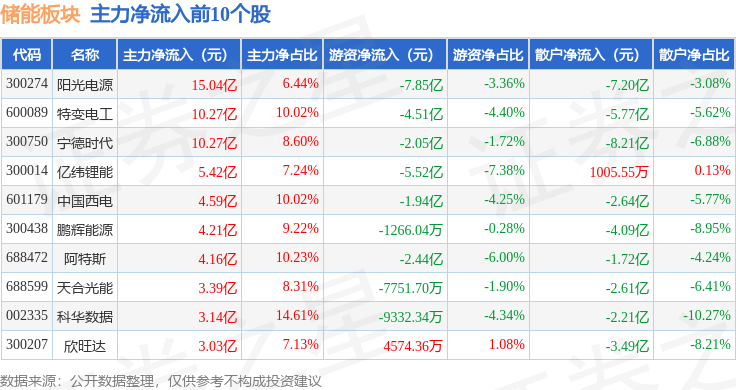 从资金流向上来看,当日储能板块主力资金净流入101.9亿元,游资资金净流出47.41亿元,散户资金净流出54.48亿元。储能板块个股资金流向见下表: