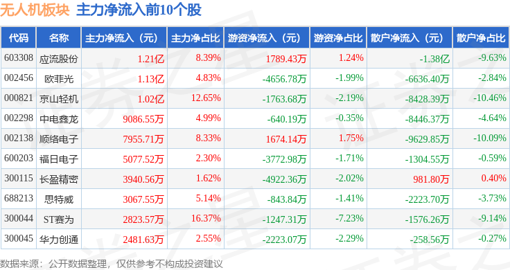 从资金流向上来看,当日无人机板块主力资金净流出18.66亿元,游资资金净流入8316.0万元,散户资金净流入17.83亿元。无人机板块个股资金流向见下表: