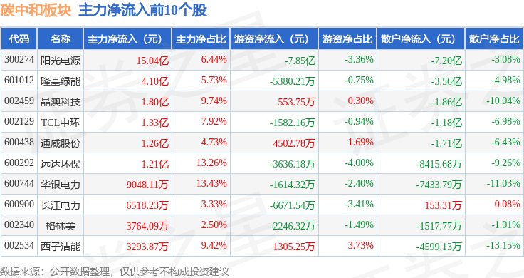 从资金流向上来看,当日碳中和板块主力资金净流入14.52亿元,游资资金净流出7.81亿元,散户资金净流出6.71亿元。碳中和板块个股资金流向见下表: