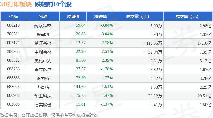证券之星消息,11月5日3D打印板块较上一交易日下跌0.24%,统联精密领跌。当日上证指数报收于3969.25,上涨0.23%。深证成指报收于13223.56,上涨0.37%。3D打印板块个股涨跌见下表: