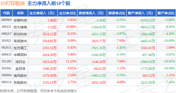 从资金流向上来看,当日3D打印板块主力资金净流出3.07亿元,游资资金净流出1.09亿元,散户资金净流入4.17亿元。3D打印板块个股资金流向见下表: