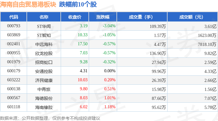从资金流向上来看,当日海南自由贸易港板块主力资金净流入12.77亿元,游资资金净流出3.78亿元,散户资金净流出8.99亿元。海南自由贸易港板块个股资金流向见下表: