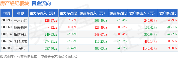 从资金流向上来看,当日房产经纪板块主力资金净流出1148.64万元,游资资金净流出286.5万元,散户资金净流入1435.14万元。房产经纪板块个股资金流向见下表: