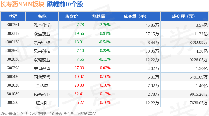 证券之星消息,11月5日长寿药NMN板块较上一交易日上涨0.37%,特一药业领涨。当日上证指数报收于3969.25,上涨0.23%。深证成指报收于13223.56,上涨0.37%。长寿药NMN板块个股涨跌见下表: