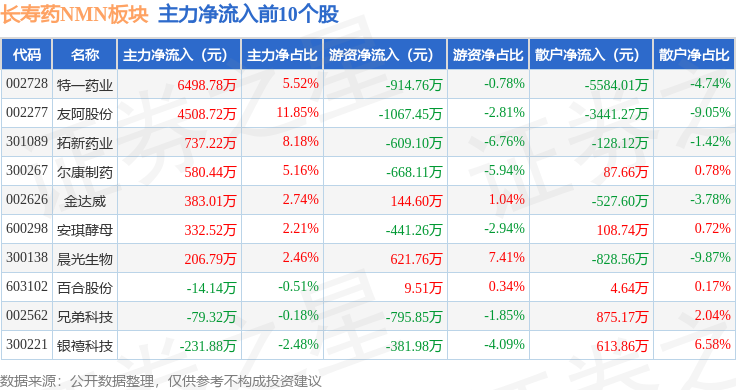 从资金流向上来看,当日长寿药NMN板块主力资金净流出139.47万元,游资资金净流出2122.93万元,散户资金净流入2262.41万元。长寿药NMN板块个股资金流向见下表: