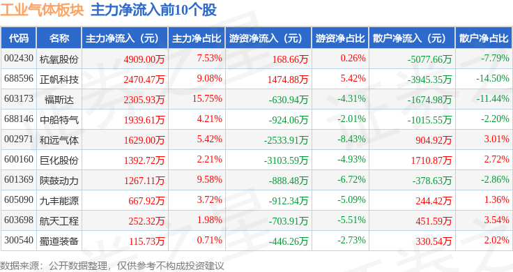 从资金流向上来看,当日工业气体板块主力资金净流出2.02亿元,游资资金净流出5784.53万元,散户资金净流入2.6亿元。工业气体板块个股资金流向见下表: