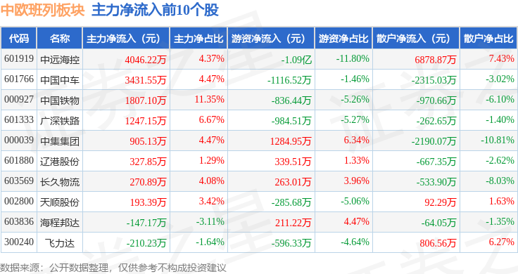 从资金流向上来看,当日中欧班列板块主力资金净流出1.36亿元,游资资金净流出1.55亿元,散户资金净流入2.91亿元。中欧班列板块个股资金流向见下表: