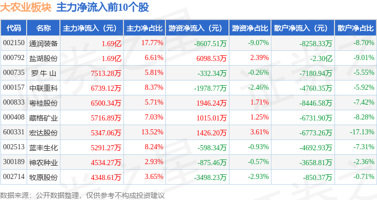 从资金流向上来看,当日大农业板块主力资金净流入5.22亿元,游资资金净流出5.08亿元,散户资金净流出1421.48万元。大农业板块个股资金流向见下表: