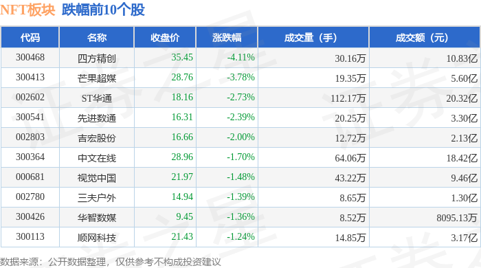 证券之星消息,11月5日NFT板块较上一交易日下跌0.34%,四方精创领跌。当日上证指数报收于3969.25,上涨0.23%。深证成指报收于13223.56,上涨0.37%。NFT板块个股涨跌见下表: