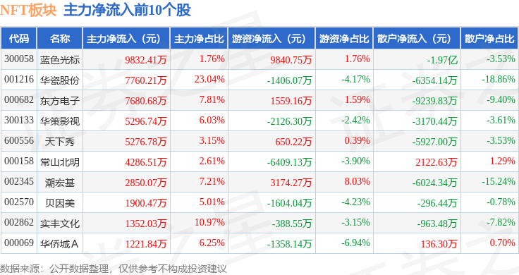 从资金流向上来看,当日NFT板块主力资金净流出5.72亿元,游资资金净流入1.05亿元,散户资金净流入4.67亿元。NFT板块个股资金流向见下表: