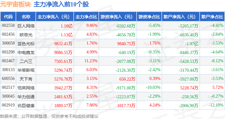 从资金流向上来看,当日元宇宙板块主力资金净流出26.46亿元,游资资金净流入3.27亿元,散户资金净流入23.19亿元。元宇宙板块个股资金流向见下表: