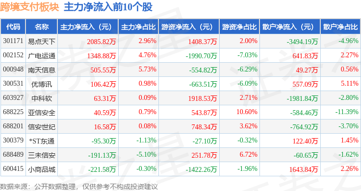 从资金流向上来看,当日跨境支付板块主力资金净流出18.1亿元,游资资金净流入1.34亿元,散户资金净流入16.76亿元。跨境支付板块个股资金流向见下表:
