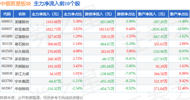 从资金流向上来看,当日中俄贸易板块主力资金净流出1.1亿元,游资资金净流出2448.33万元,散户资金净流入1.35亿元。中俄贸易板块个股资金流向见下表: