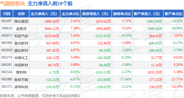 从资金流向上来看,当日气凝胶板块主力资金净流出1.64亿元,游资资金净流入6188.19万元,散户资金净流入1.02亿元。气凝胶板块个股资金流向见下表: