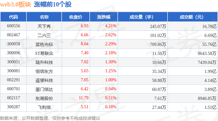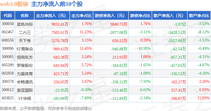 从资金流向上来看,当日web3.0板块主力资金净流出7.29亿元,游资资金净流入2457.89万元,散户资金净流入7.05亿元。web3.0板块个股资金流向见下表: