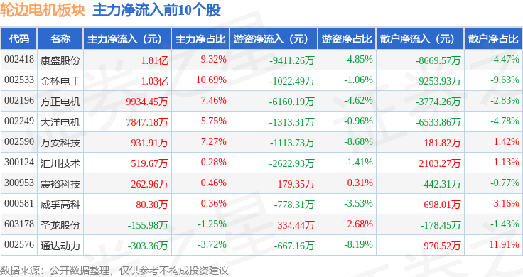 从资金流向上来看,当日轮边电机板块主力资金净流入3.14亿元,游资资金净流出2.11亿元,散户资金净流出1.03亿元。轮边电机板块个股资金流向见下表: