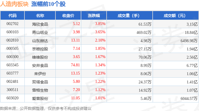 证券之星消息,11月5日人造肉板块较上一交易日上涨0.23%,海欣食品领涨。当日上证指数报收于3969.25,上涨0.23%。深证成指报收于13223.56,上涨0.37%。人造肉板块个股涨跌见下表: