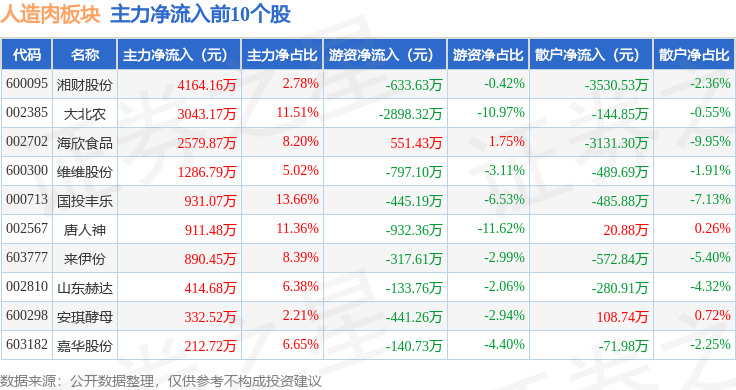 从资金流向上来看,当日人造肉板块主力资金净流入3490.7万元,游资资金净流出5944.69万元,散户资金净流入2453.99万元。人造肉板块个股资金流向见下表: