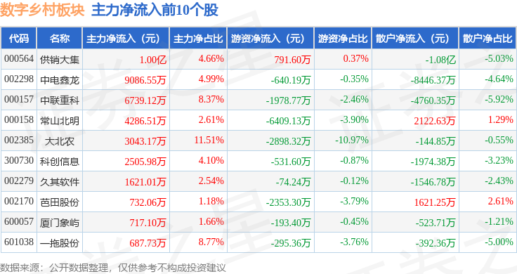 从资金流向上来看,当日数字乡村板块主力资金净流出11.93亿元,游资资金净流出5663.25万元,散户资金净流入12.5亿元。数字乡村板块个股资金流向见下表: