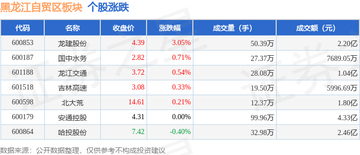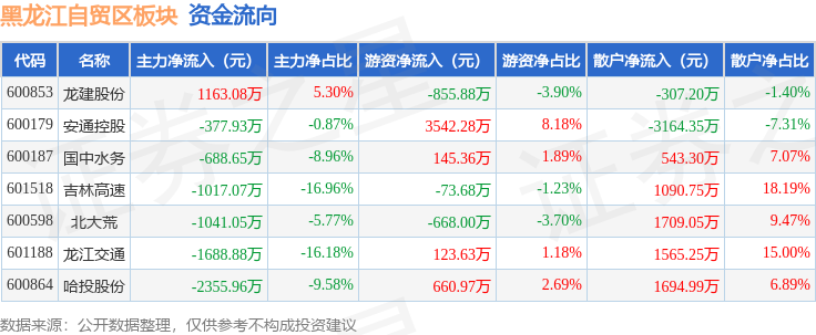 从资金流向上来看,当日黑龙江自贸区板块主力资金净流出6006.47万元,游资资金净流入2874.68万元,散户资金净流入3131.79万元。黑龙江自贸区板块个股资金流向见下表: