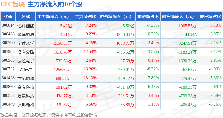 从资金流向上来看,当日ETC板块主力资金净流出3459.92万元,游资资金净流出5.96亿元,散户资金净流入6.3亿元。ETC板块个股资金流向见下表: