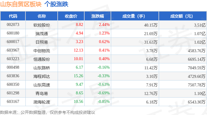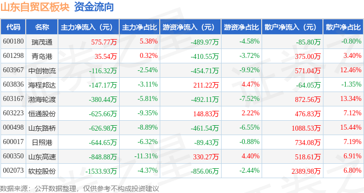 从资金流向上来看,当日山东自贸区板块主力资金净流出4312.73万元,游资资金净流出2564.06万元,散户资金净流入6876.78万元。山东自贸区板块个股资金流向见下表: